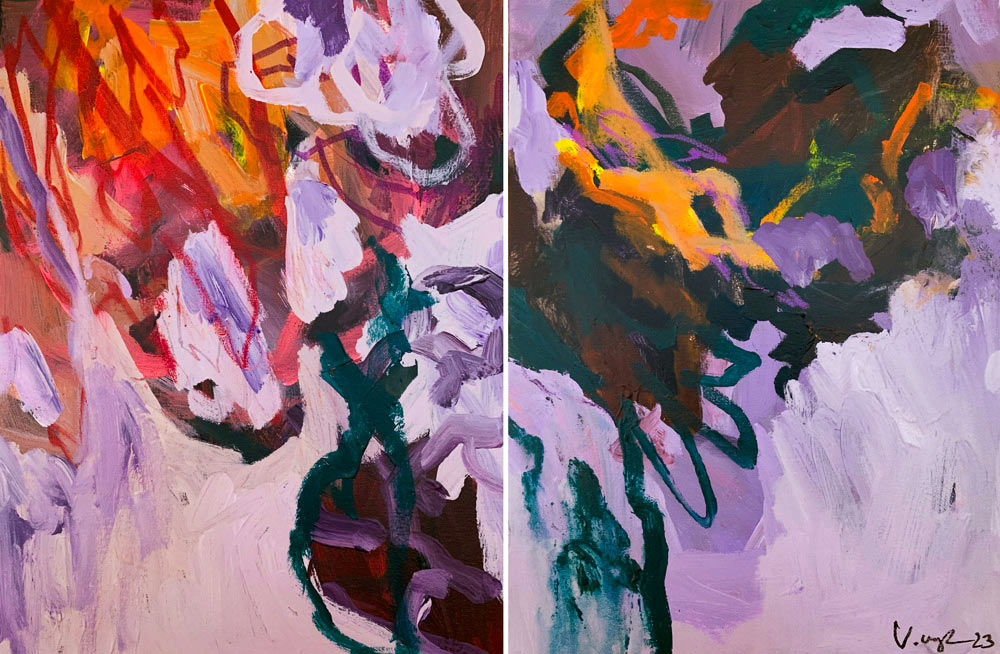 Diese Arbeiten entstanden 2023 in einem intensiven Prozess zwischen zwei Ausstellungen: Der erste Teil wurde in der Modern Art Gallery Karlsruhe gezeigt, der zweite im Juli in der Cline House Gallery in Cornwall, Kanada. Dazwischen – in der Zeit zwischen den Kontinenten – sind alle Bilder dieser Serie entstanden.