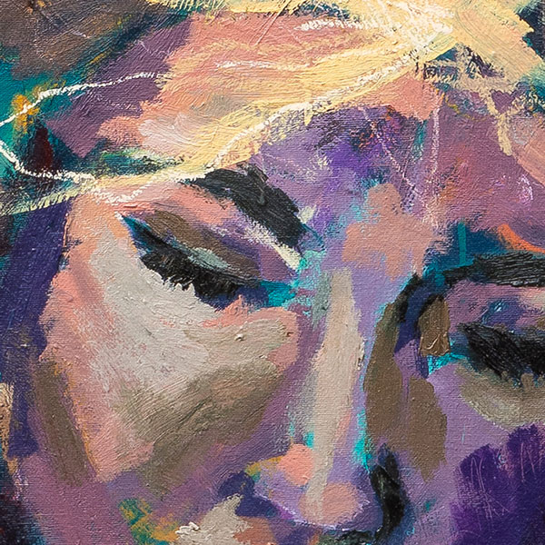 Ich male häufig Portraits, auch unter Bilder, aber ich übermale sie häufig. Das Figurative lenkt in meinen Augen oft von der Botschaft ab. Aber bisweilen bleibt ein Porträt bestehen. Und in diesem Fall geht es nicht um das Porträt, es geht um die Gedanken, die sich aus ihrem Kopf befreien.