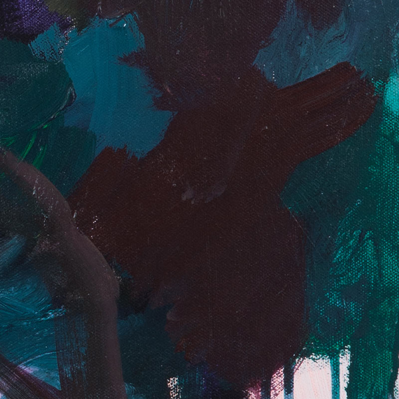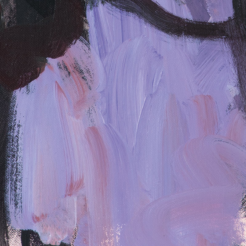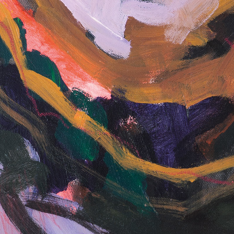 Die Farben – tiefes Schwarzlila, sattes Schwarzgrün überlagern feuriges Orange und kühles Lila – wirken dunkel, aber nicht verschlossen.