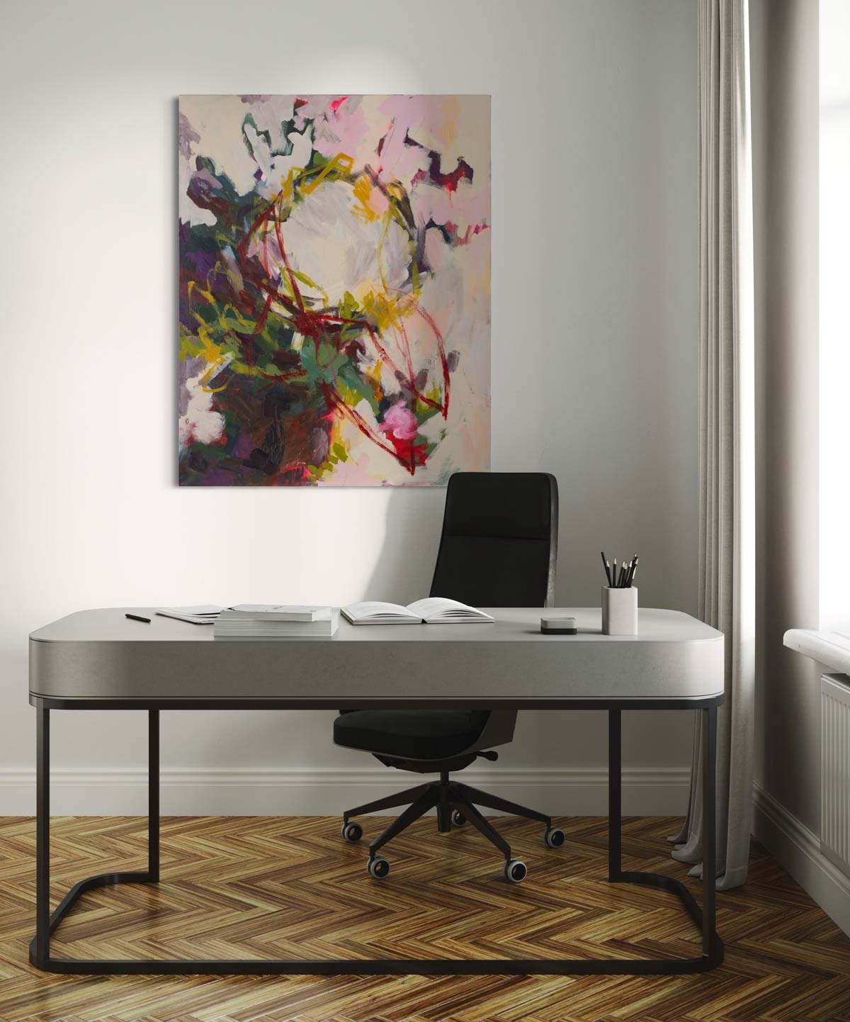 Gemeinsam besprechen wir deine Fragen zu Größe, Wirkung, Raumwirkung – und wenn du möchtest, erstelle ich dir kostenlos eine digitale Vorschau des Bildes in deinem Raum (Hängeservice). Dafür brauchst du nur ein Foto deiner Wand.